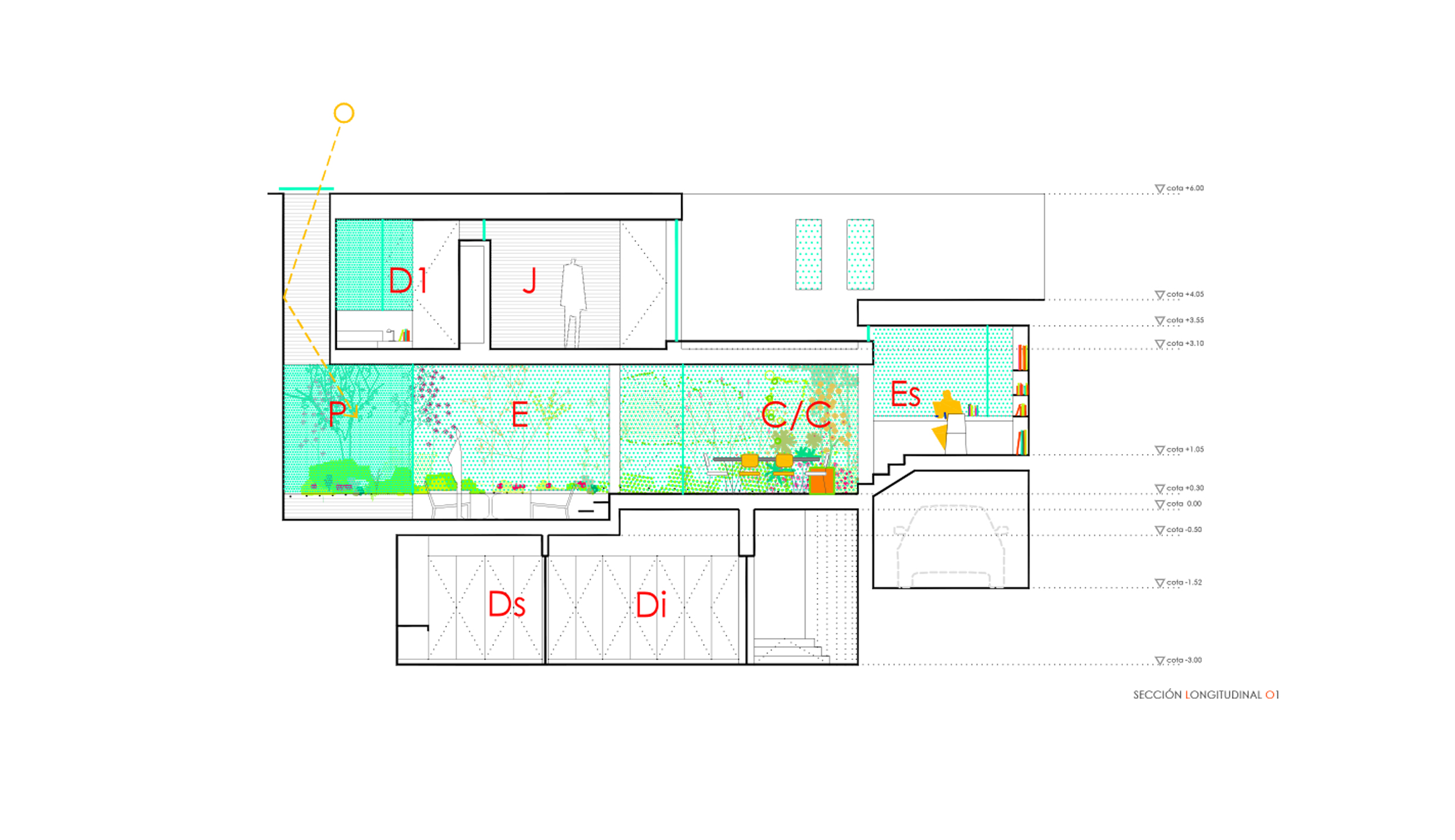 El cuarto patio se entierra creando un reducido jardín bajo rasante como fuente de aire y luz natural.