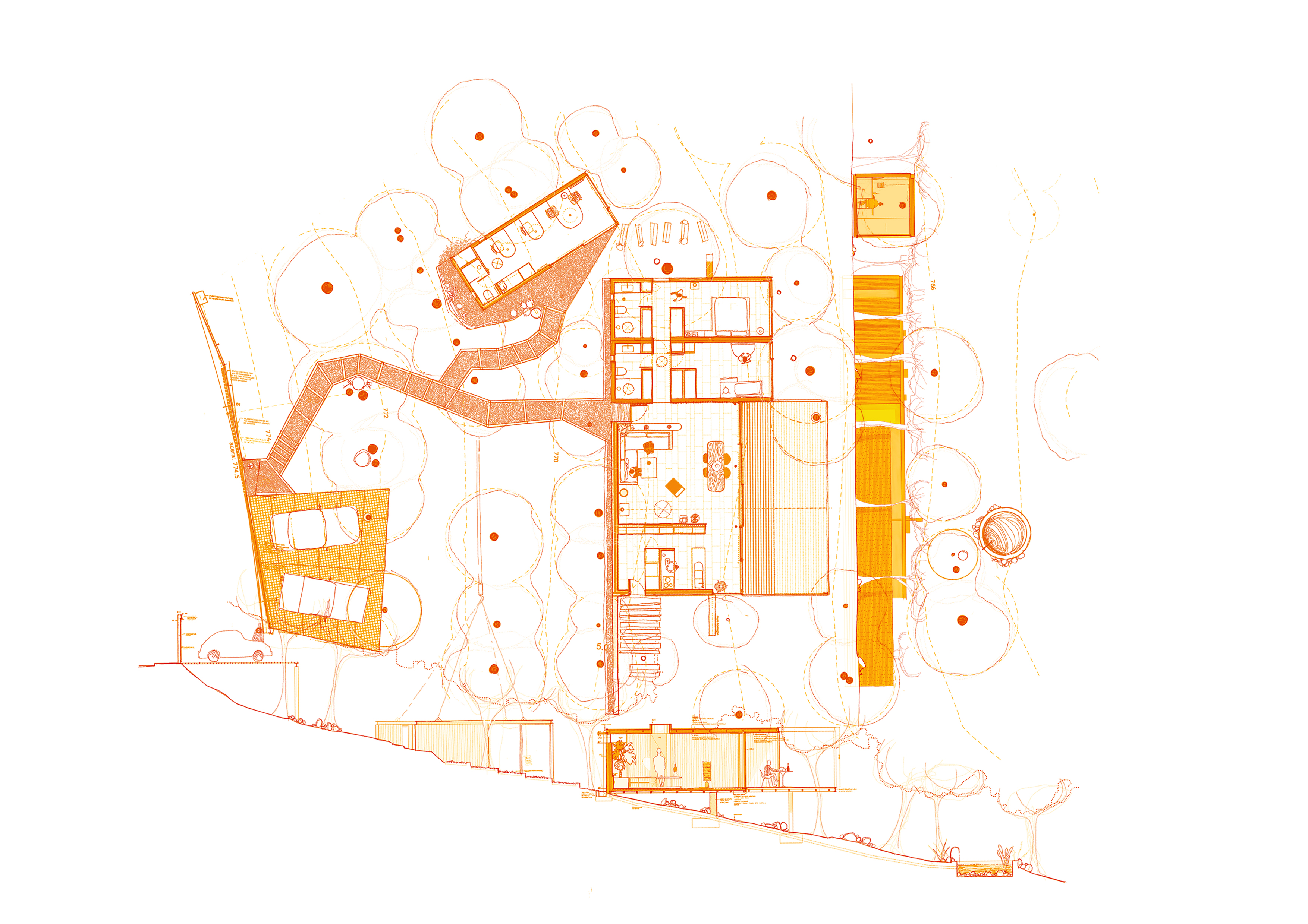 La obsesión del proyecto era mantener todos los árboles y alterar lo mínimo posible el terreno existente, así la casa tiene la dimensión exacta del hueco que dejaron los árboles, el punto de luz entre las copas. La estructura parte de la cota natural del terreno, desde ahí se apoya en un muro intermedio y acaba en un voladizo atirantado.