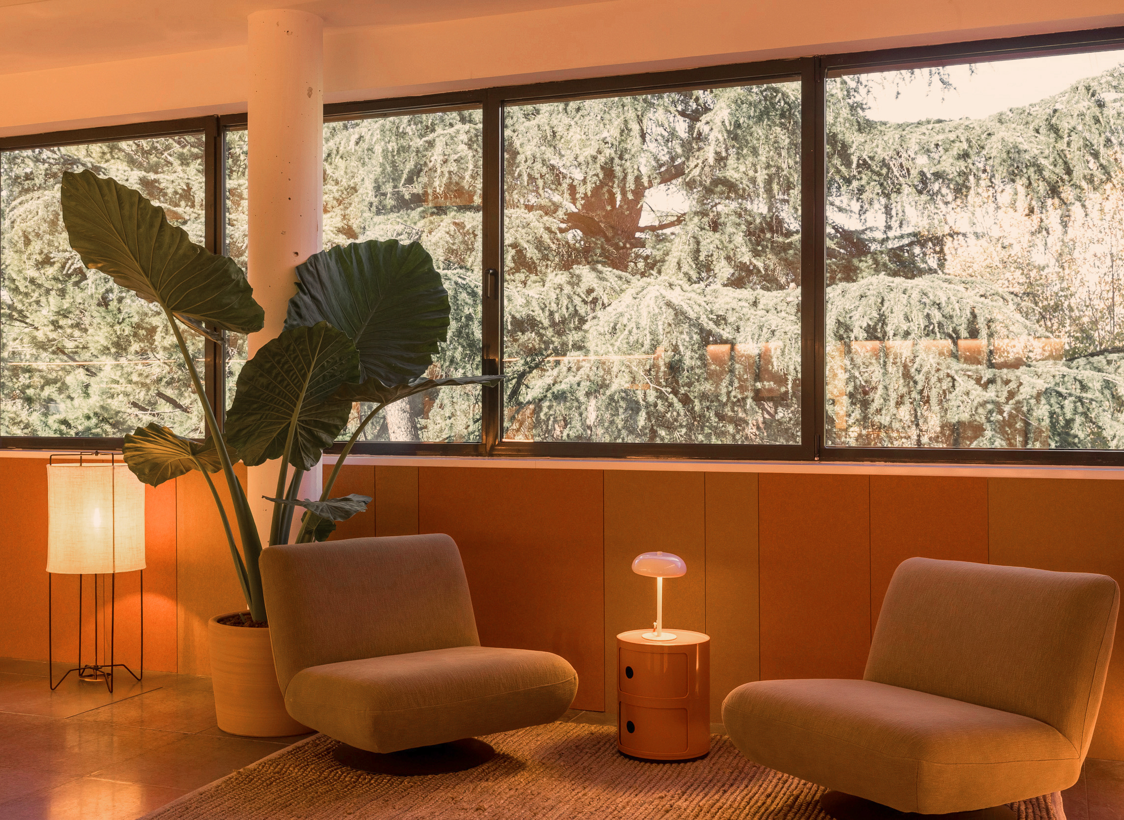 Este carácter industrial se equilibra mediante madera en particiones, puertas, mobiliario y detalles que aportan un contrapunto cálido y amable. Los panelados naranjas y los revestimientos acústicos de PET reciclado, en sutiles variaciones del naranja tini, construyen un hilo cromático coherente con el brand book de la empresa. El último toque se da con plantas exuberantes, como la gran alocasia, que da ambiente y frescor visual.