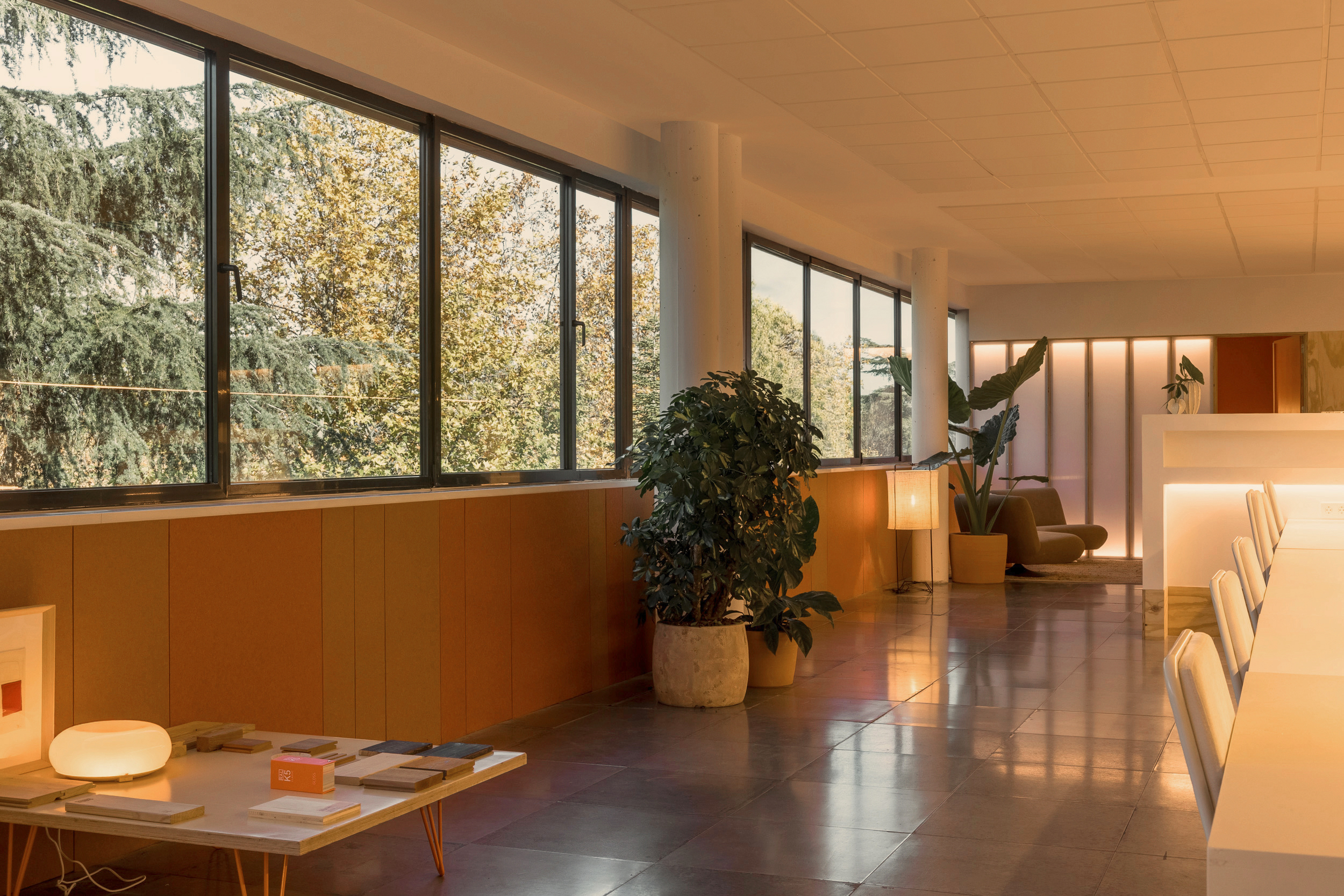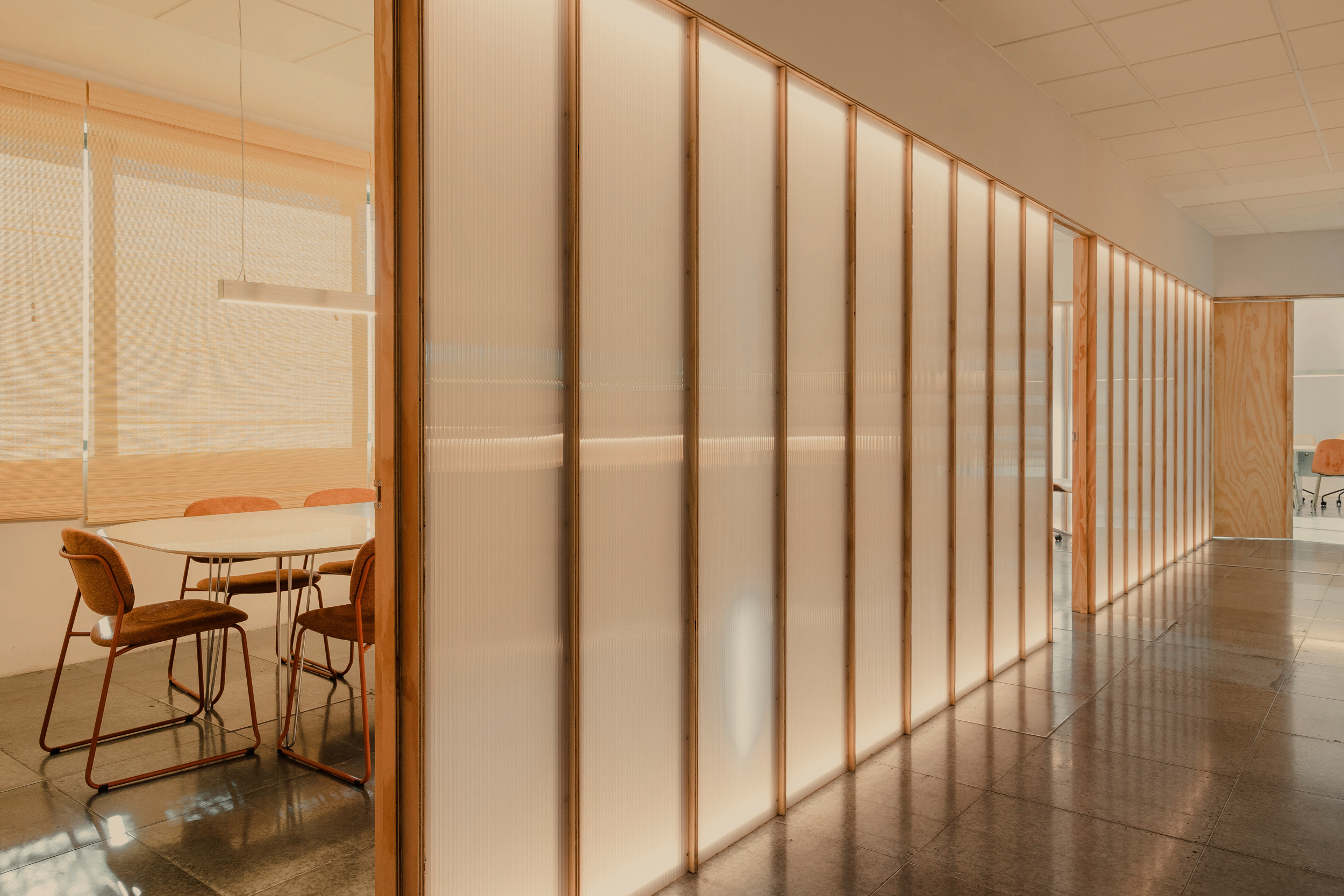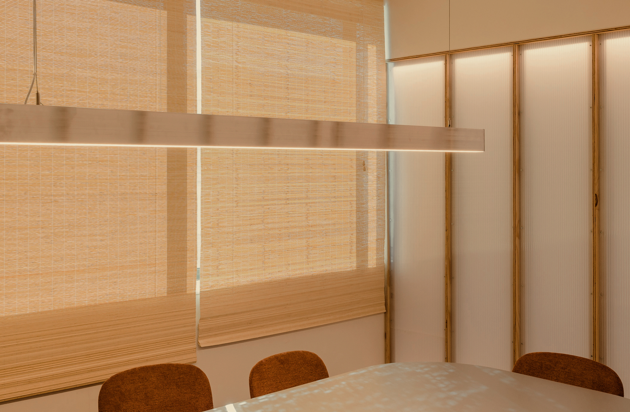 On the less pleasant façade, the meeting rooms are grouped, closed toward the central space by a partition of wooden ribs and backlit translucent polycarbonate, finished with bamboo blinds. This softens the view without sacrificing brightness.