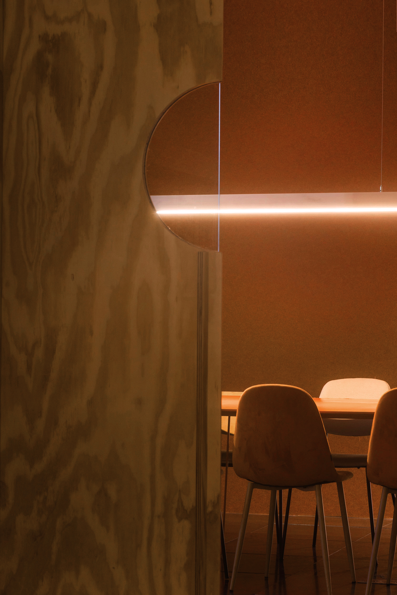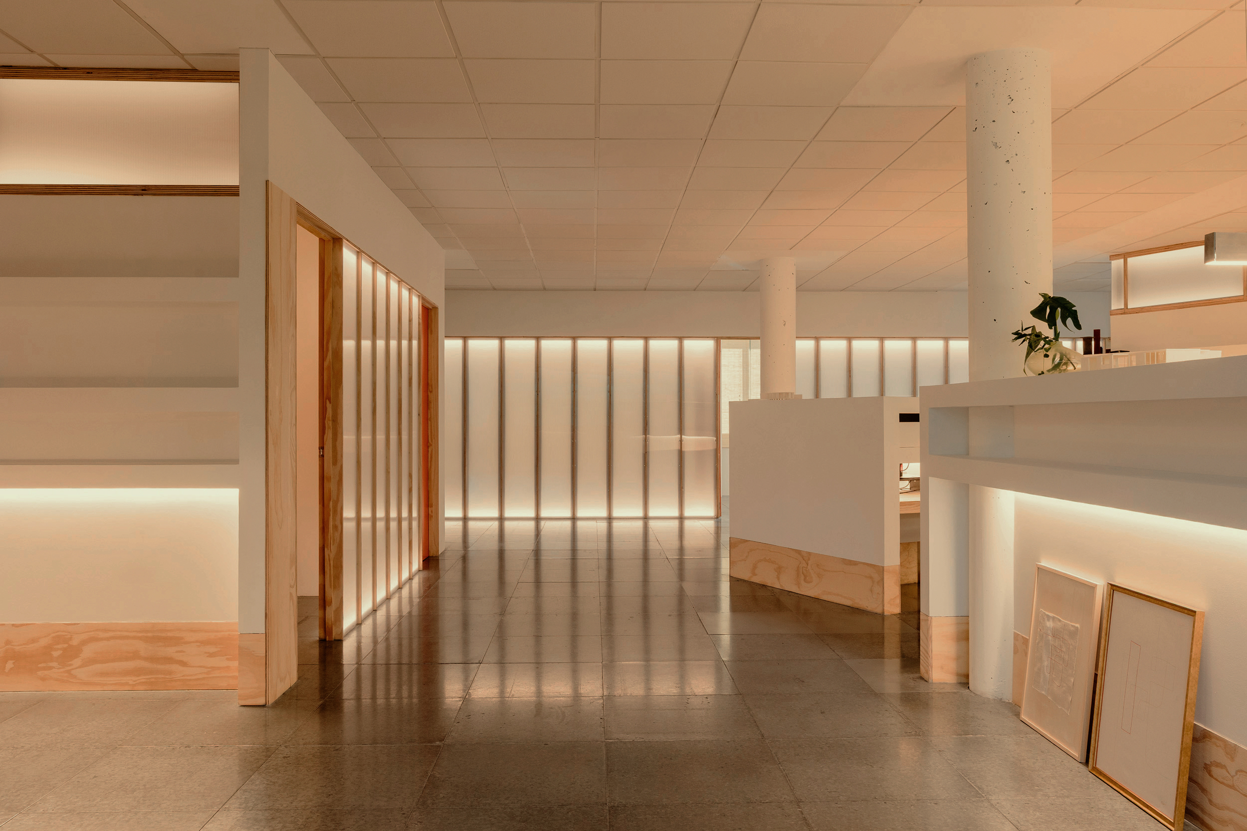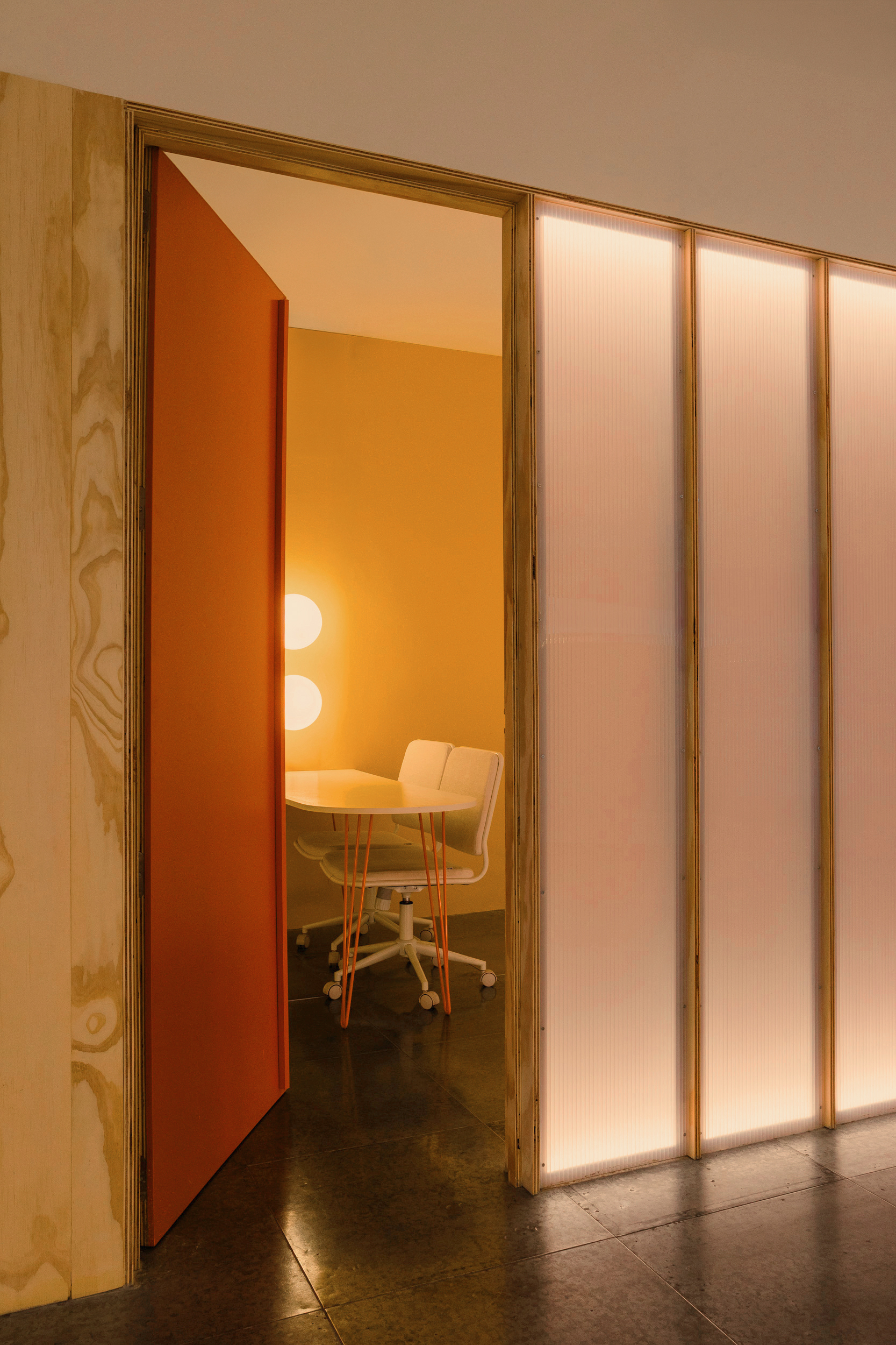 On the less pleasant façade, the meeting rooms are grouped, closed toward the central space by a partition of wooden ribs and backlit translucent polycarbonate, finished with bamboo blinds. This softens the view without sacrificing brightness.