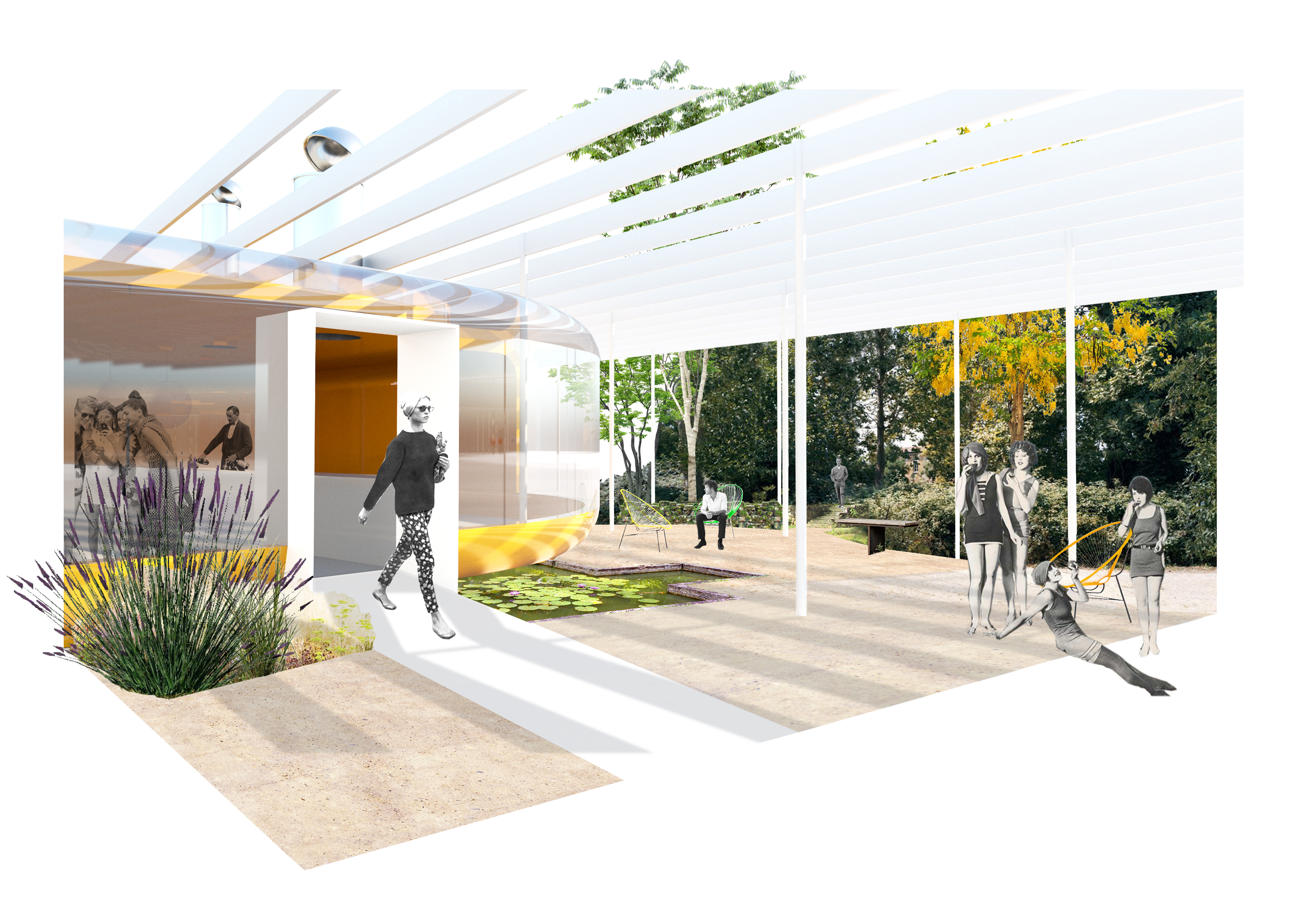 La vegetación, el recorrido de agua y los distintos colores de este nuevo paisaje se infiltran en los edificios existentes generando nuevas espacialidades y acomodando los nuevos usos del centro de promoción.